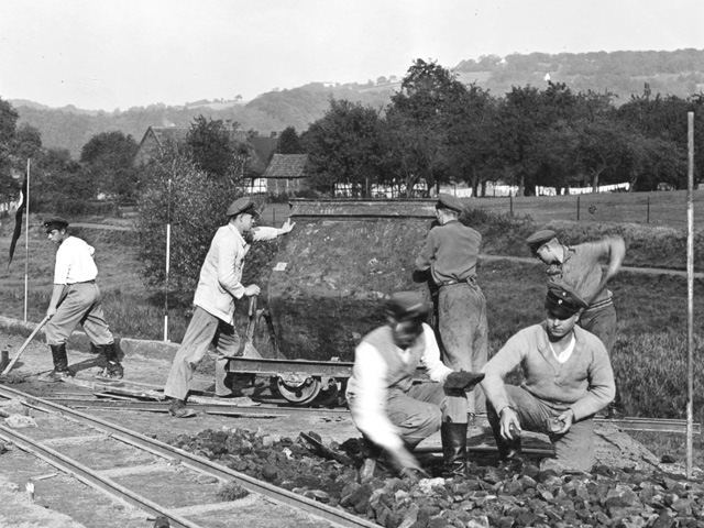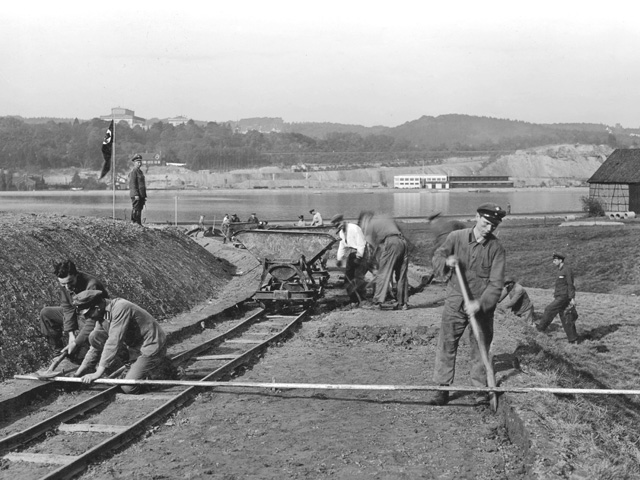 Ende 1929 begann die Weltwirtschaftskrise. Als die Baustelle im Dezember 1931 nach sieben Monaten Bauzeit bankrott war, setzte man ab Frühjahr 1932 bis zu 2000 Arbeiter im Rahmen des FAD (Freiwilliger Arbeitsdienst) ein. So profitierte der Ruhrverband durch die Einnahme von Darlehensgeldern aus der Erwerbslosenfürsorge für den Bau.[1] Die Arbeiter waren oft nur mit primitiven Werkzeugen ausgerüstet. Sie erhielten zwischen 1,00 und 1,80 Reichsmark und eine warme Mahlzeit am Tag.