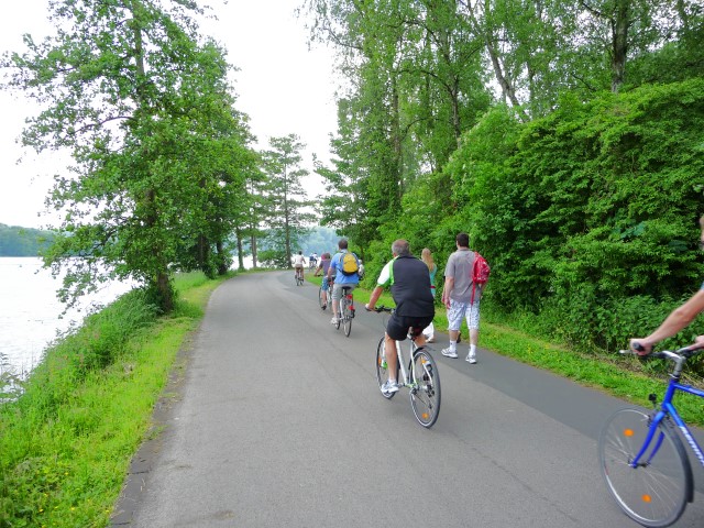 Die gesamte Strecke um den See ist ca. 14 km lang, wenn es nicht mehr geht, bringt Sie auch die Weisse Flotte mit dem Schiff wieder zu Ihrem Ausgangspunkt Ihrer Radreise zurück. [mit dem Fahrrad um den Baldeneysee in Essen]